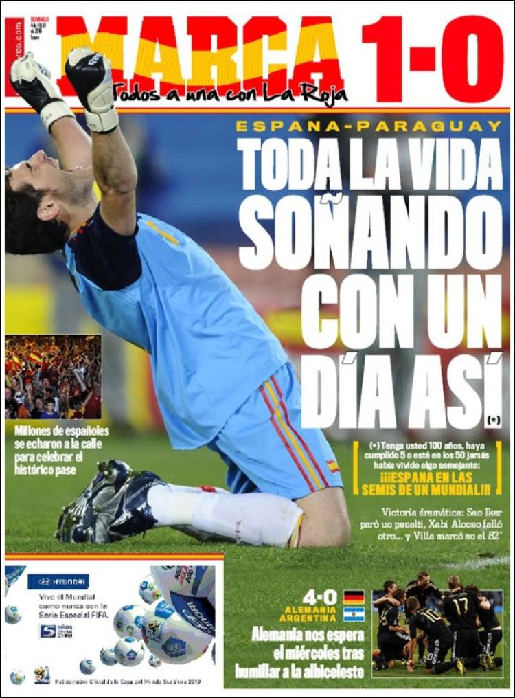 MADRID (Spagna) – La Spagna e tutti gli spagnoli erano anni che sognavano una notte così, come potete capire benissimo dal titolo della prima pagina di Marca. Infatti le Furie Rosse in tutta la loro storia non hanno mai vinto un Mondiale ma la cosa clamorosa è che non erano mai arrivati in semifinale prima di ora dopo aver vinto, soffrendo, per 1 a 0 contro il Paraguay ieri sera grazie ad un gol di David Villa all’83esimo minuto.