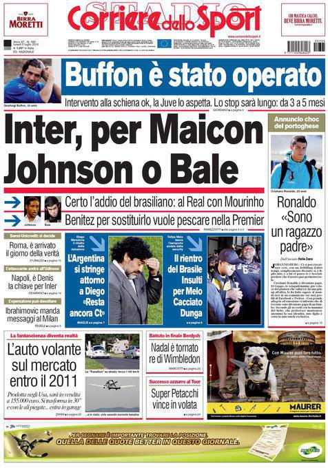 Sul Corriere dello Sport si parla del calciomercato dell’Inter con l’affare Maicon che è vicino alla conclusione. Il brasiliano è in procinto di passare al Real Madrid, in cambio Benitez vorrebbe portare a Milano o Johnson o Bale, entrambi provenienti dalla Premier League. In particolare il secondo, giovane gallese del Tottenham che piace anche a Juventus e Milan, mentre l’inglese gioca nel Liverpool.