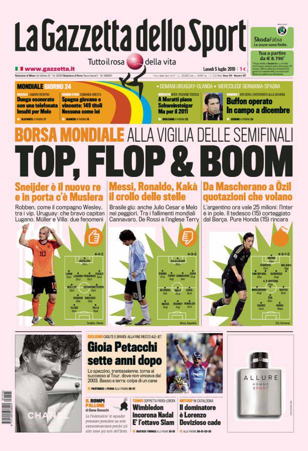 Sulla Gazzetta dello Sport si parla del Mondiale sudafricano con tutti i protagonisti in positivo ed in negativo. A guidare la nuova generazione di campioni è l’interista Sneijder, autore di un grande Mondiale con la sua Olanda che in semifinale affronterà l’Uruguay di Muslera e Cavani. Deludono le stelle acclamate alla vigilia, ovvero Kakà, Cristiano Ronaldo e Messi.