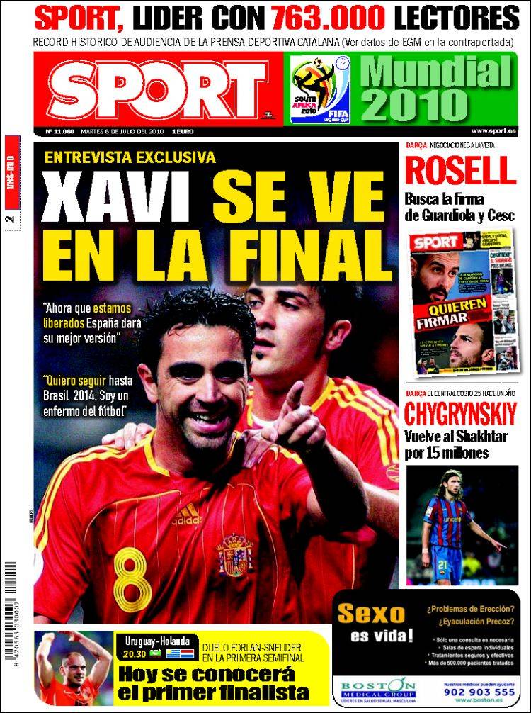 Sull’altro quotidiano catalano Sport intervista esclusiva al centrocampista del Barcellona e della Nazionale spagnola Xavi. Il giocatore ha rassicurato i tifosi in vista della semifinale Mondiale tra la Spagna e la Germania in programma domani sera, assicurando che gli iberici giocheranno sicuramente al meglio delle loro possibilità per non deludere l’intero Paese che sogna la vittoria Mondiale.