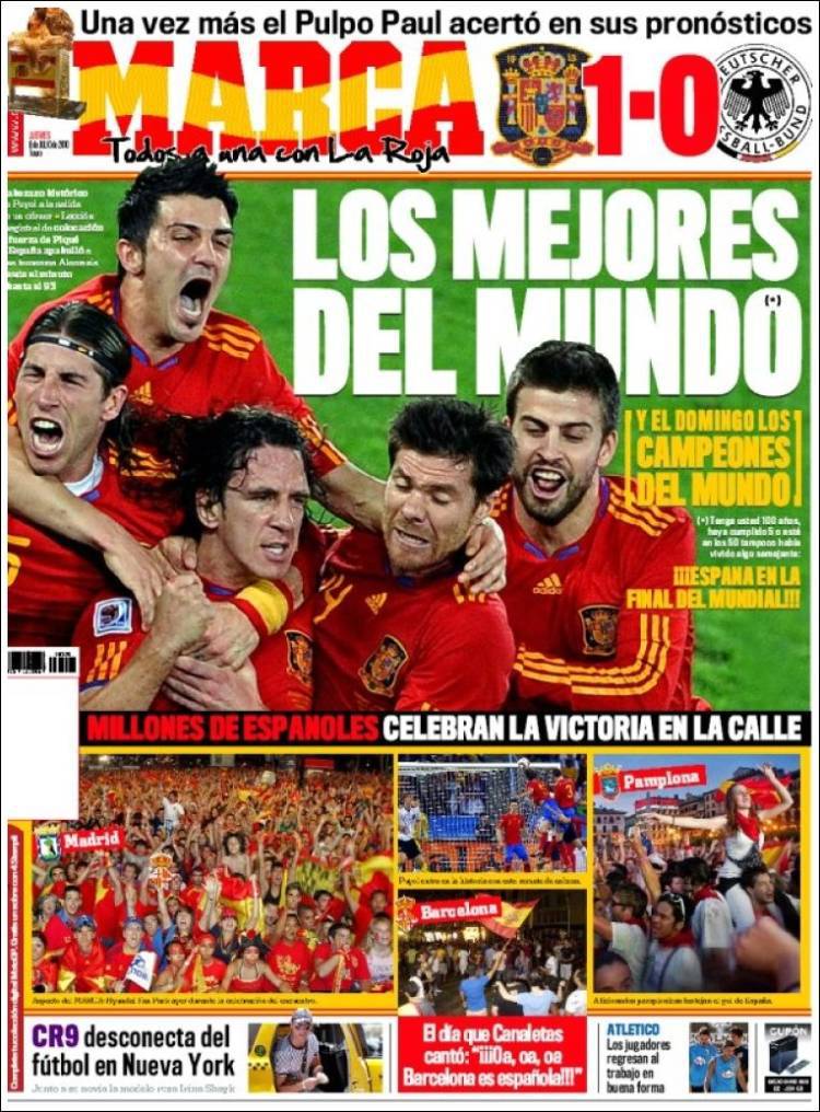 Emblematico il titolo del quotidiano spagnolo Marca che celebra la vittoria della Spagna contro la Germania nella semifinale del Mondiale sudafricano. Per la prima volta gli spagnoli approdano in finale dopo affronteranno l’Olanda di Sneijder e Robben, una formazione che ha già mostrato la propria forza contro il Brasile. Ieri sera il gol vittoria è stato siglato da Puyol.