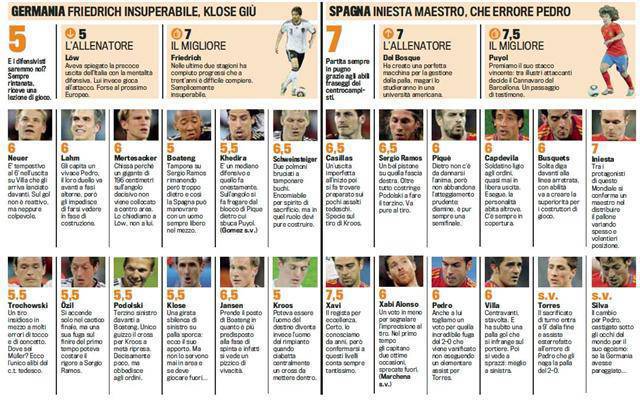 DURBAN (Sudafrica) – La seconda semifinale tra Germania e Spagna vede la vittoria degli spagnoli per uno a zero grazie a Puyol, centrale difensivo autore di una grande partita. Bene anche Xavi e Iniesta, i due “cervelli” del gioco iberico. Nella Germania delude Klose, mai pericoloso, mentre non incidono i vari Podolski e Ozil. Grande prova del difensore tedesco Friedrich. Ecco le pagelle della Gazzetta dello Sport.
