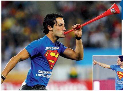 DURBAN (Sudafrica) – Primo tempo, 3’30”, spunta l’invasore, con tanto di vuvuzela, gara sospesa. Si tratta di Mario Ferri, che nel novembre del 2009 sospese l’amichevole Italia-Olanda (e poi in campionato Samp-Napoli). Ferri, che aveva annunciato l’invasione, anche ieri aveva una scritta pro Cassano e contro Lippi: «Cassano in Nazionale, Lippi te l’avevo detto». Fermato, sarebbe stato subito processato.