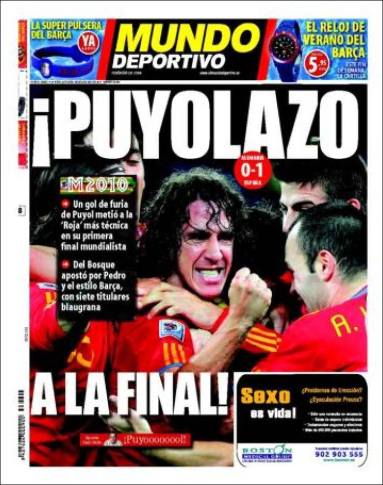 Sul quotidiano catalano Mundo Deportivo prima pagina tutta dedicata a Puyol, centrale della Nazionale spagnola e del Barcellona autore del gol vittoria che ha permesso alla Spagna di battere la Germania e di volare in finale ai Mondiali sudafricani dove incontrerà l’Olanda. Una partita tirata dove gli spagnoli hanno giocato meglio dimostrato la propria forza in fase di possesso palla.