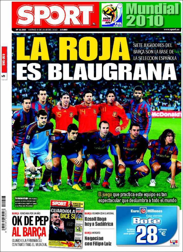 Il quotidiano catalano Sport si prepara per la finale del Mondiale sudafricano tra Spagna e Olanda. Viene soprattutto sottolineato che la spina dorsale della Spagna di Del Bosque è costituita da ben 7 giocatori del Barcellona, con Puyol, Xavi, Iniesta e Villa protagonisti indiscussi del Mondiale della formazione iberica. Una Spagna sempre più a tinte blaugrana.