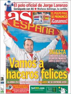Sul quotidiano spagnolo As intervista esclusiva al centrocampista della Spagna Iniesta che ha parlato della finale del Mondiale sudafricano di domenica sera tra la Spagna e l’Olanda. Il centrocampista del Barcellona, sicuro titolare nell’undici di Del Bosque, vuole conquistare le felicità ovvero la Coppa del Mondo che la Spagna non ha mai vinto, un’occasione unica.