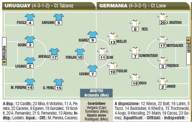 JOHANNESBURG (Sudafrica) – Stasera si gioca la prima finale del Mondiale di Sudafrica, stiamo parlando della finale per il terzo ed il quarto posto che si giocherà tra Uruguay e Germania rispettivamente sconfitte dall’Olanda e dalla Spagna e proprio domani ci sarà la finale tra queste due nazionali. Ecco a voi le probabili formazioni della partita di stasera prese dal Corrirere dello Sport.