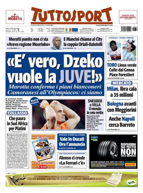 Sul quotidiano torinese Tuttosport spazio alle dichiarazioni rilasciate dal nuovo dirigente sportivo della Juventus Beppe Marotta che ha parlato del reale interesse dei bianconeri nei confronti del bomber bosniaco Edin Dzeko, attualmente al Wolfsburg. Marotta ha poi confermato la volontà del giocatore di venire in Italia e giocare nella Juventus, ma il prezzo del cartellino è alto.