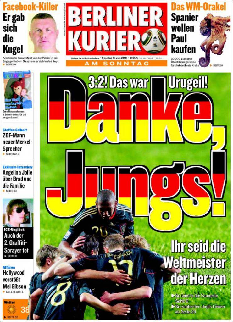 BERLINO (Germania) – La stampa tedesca come possiamo capire dalla prima pagina del Berliner Kurier è comunque soddisfatta della propria nazionale che nonostante era data per favorita dopo che aveva giocato un ottimo calcio nel girone, negli ottavi e nei quarti è stata battuta in semifinale dalla Spagna. Ieri tuttavia si è giocata la finale per il terzo e quarto posto ed i tedeschi hanno battuto, seppur soffrendo l’Uruguay per 3-2.