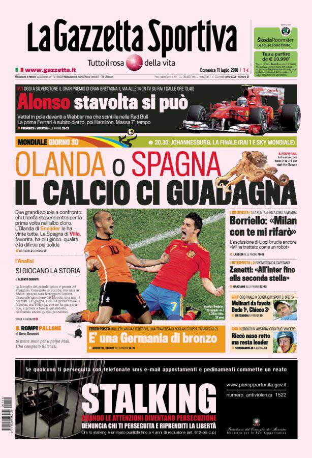 MILANO – La prima pagina della Gazzetta dello Sport con una rima fa capire quante aspettative ci sono sulla finale di stasera che si disputerà tra Olanda e Spagna, due squadre piene di campioni e di fenomeni. Gli olandesi hanno una storia calcistica che parte da veramente tanto lontano, entrambe le squadre non hanno mai vinto il Mondiale anche se l’Olanda è arrivata in finale di volte ma è sempre stata batttuta, mentre la Spagna non era mai arrivata ai quarti negli anni passati, chissà chi avrà la meglio: in questo caso, chi vivrà, vedrà…