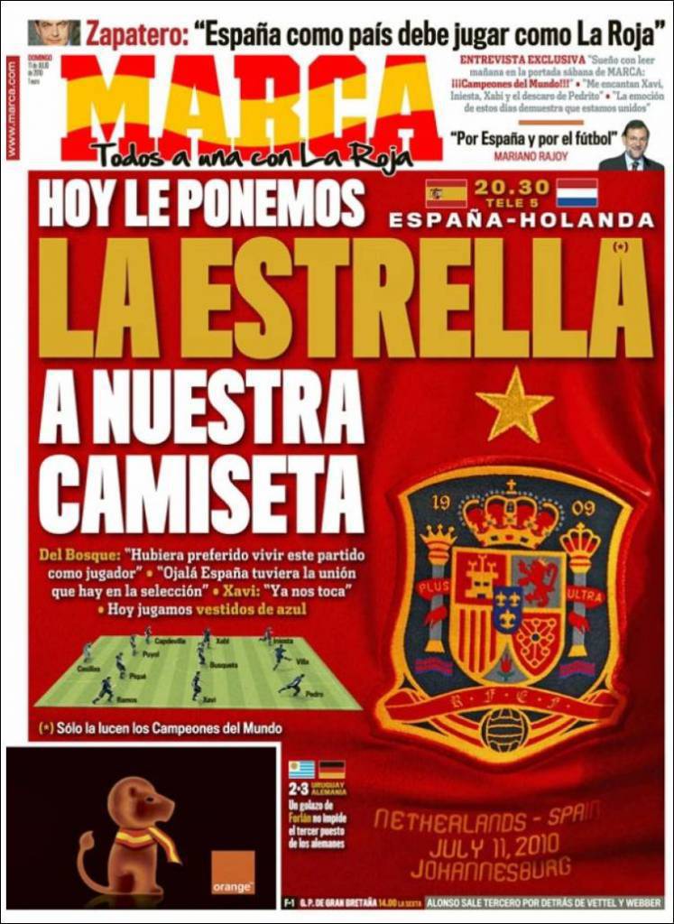 MADRID (Spagna) – Il titolo della prima pagina di Marca non è molto scaramantico, anzi, infatti come scritto poco più sopra il titolo del quotidiano iberico è “Oggi possiamo mettere la stella sulla nostra maglia” riferendosi al fatto che stasera si gioca la finale del Mondiale Olanda-Paraguay e nel caso in cui vincessero gli spagnoli potrebbero mettere la stella d’orara sopra lo stemma della nazionale come riconoscimento della vittoria, la prima vittoria in un Mondiale.