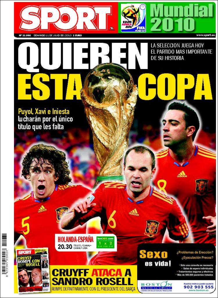 MADRID (Spagna) – I giocatori della Spagna sono già entrati nella storia calcistica iberica, visto che le Furie Rosse non erano mai arrivate ai quarti di un Mondiale prima di quest’anno, ma addirittura sempre nello stesso torneo sono arrivati in finale battendo ogni record. Stasera la sfida è con l’Olanda, anch’essa non ha mai vinto un Mondiale ma è arrivata due volte in finale uscendone entrambe le volte sconfitta, tuttavia i giocatori della Spagna caricano la squadra dichiarando: “Vogliamo questa coppa”.