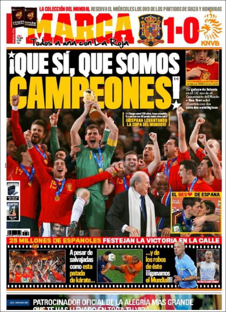 MADRID (Spagna) – Esaltazione fra le testate spagnole, che esaltano la vittoria iberica nella coppa del mondo. In prima pagina, accanto alla gigantografia dei festeggiamenti, alcune foto che riportano il film del match.