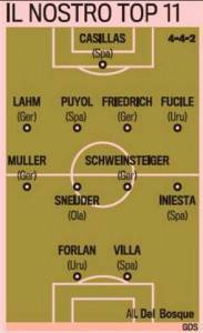 JOHANNESBURG (Sudafrica) – Nella top11 del Mondiale dominano le nazionali europee, con Spagna, Olanda e Germania su tutte. Gli unici non europei sono gli uruguayani Fucile e Forlan, autori veramente di un grande campionato del mondo. Un posto ovviamente all’uomo dell’anno, Andres Iniesta, che con il suo goal ha trascinato la Spagna in cima al mondo.