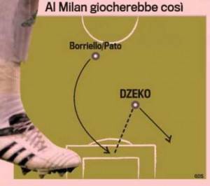 MILANO – Edin Dzeko ha dichiarato di voler approdare al Milan nella prossima stagione. Trattativa difficile soprattutto perchè il Wolfsburg continua a chiedere circa 40 milioni di euro. Oggi la Gazzetta dello Sport ha immaginato il bomber bosniaco all’interno dello scacchiere tattico dei rossoneri, con Pato o Borriello dietro il centravanti del Wolfsburg. Ecco la foto.