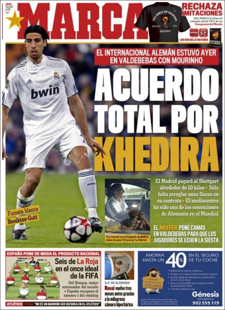 Sul quotidiano spagnolo Marca si parla del calciomercato del Real Madrid con i madrileni vicini all’acquisto del centrocampista difensivo Khedira, nazionale tedesco in forza allo Stoccarda. Il giocatore è voluto fortemente da Josè Mourinho che vuole rinforzare il centrocampo con gente forte fisicamente e tatticamente. Il Real ha già acquistato Di Maria.