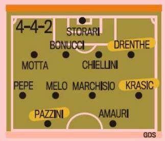 PINZOLO – Ecco in anteprima la nuova Juventus che si schiererà con il classico 4-4-2 di Gigi Delneri. In porta, fintanto che Buffon non si rimetterà, ci sarà Storari. Difesa a 4 con Motta, Chielli, Bonucci e Drenthe, che dovrebbe arrivare da Torino via Madrid. A centrocampo Marchiso e Felipe Melo dovrebbero “far legna” per lasciare liberi di spingere Pepe e Krasic (o Martinez). Davanti il sogno è la coppia Pazzini-Amauri.