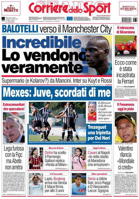 Anche il Corriere dello Sport apre con un titolo dedicato a Mario Balotelli, talento dell’Inter. La società di Massimo Moratti ha deciso di vendere il giovane calciatore fissando il prezzo sui 40 milioni di euro. Il club più interessato è il Manchester City di Roberto Mancini che avrebbe offerto 30 milioni di euro, mentre l’Inter è ferma sulla cifra richiesta in precedenza.