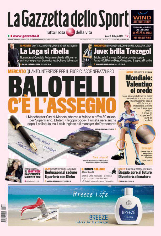 Sulla Gazzetta dello Sport si parla del calciomercato dell’Inter ed in particolare del futuro di Mario Balotelli. Ieri una delegazione del Manchester City è sbarcata a Milano con un assegno da 30 milioni di euro per il talento nerazzurro. Offerta respinta dal club meneghino che chiede almeno 40 milioni di euro. Anche l’entourage del giocatore ha rifiutato per il momento l’offerta dei “Citizens”.
