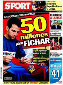 Sul quotidiano catalano Sport si parla dell’interesse del Barcellona per Cesc Fabregas, centrocampista spagnolo dell’Arsenal. Il club inglese non intende privarsi del giocatore Campione del Mondo per meno di 50 milioni di euro. Il direttivo dei blaugrana potrebbe investire quella cifra per formare il centrocampo della Nazionale spagnola che ha trionfato agli ultimi Mondiali.