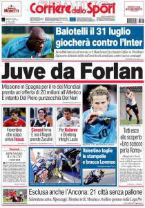 Il Corriere dello Sport apre con una notizia di mercato che riguarda la Juventus. La società bianconera è pronta a fare una grande offerta all’Atletico Madrid per Diego Forlan, centravanti uruguagio dell’Atletico Madrid, Pallone d’Oro del Mondiale sudafricano. I “Colchoneros” per il proprio bomber chiedono circa 20 milioni di euro. Marotta volerà in Spagna nei prossimi giorni.