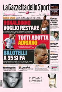Sulla Gazzetta dello Sport si parla del calciomercato di Inter, Roma e Milan. L’Inter potrebbe cedere Mario Balotelli per 35 milioni di euro al Manchester City, mentre nel Milan il brasiliano Ronaldinho dice no alle offerte del Flamengo e di restare in rossonero. In casa Roma Francesco Totti elogia Adriano che in allenamento ha già smaltito cinque chili in eccesso.