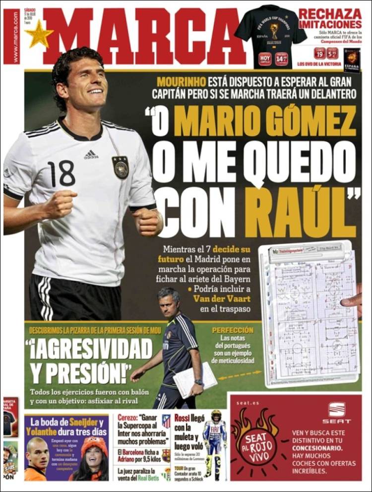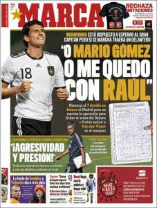 Sul quotidiano spagnolo Marca si parla del futuro dello storico capitano del Real Madrid Raul. Il nuovo tecnico dei madrileni Josè Mourinho è stato chiaro: o rimane Raul altrimenti le “merengues” sarebbero costrette a comprare un altro attaccante e Mourinho avrebbe messo nel mirino Mario Gomez, centravanti tedesco del Bayern Monaco. Nell’operazione con i tedeschi potrebbe entrare Van der Vaart.
