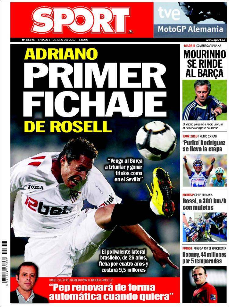 L’altro quotidiano catalano Sport ripercorre le orme del Mundo Deportivo parlando del primo acquisto del Barcellona dell’era Rosell. Il nuovo presidente blaugrana ha infatti acquistato l’esterno brasiliano Adriano dal Siviglia, su precise indicazioni di Pep Guardiola. Il giocatore è stato pagato circa 9,5 milioni di euro e si legherà ai catalani per le prossime quattro stagioni.