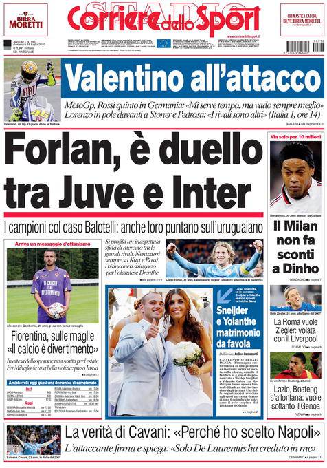 ROMA – Secondo quanto riporta e titola in prima pagina il Corriere dello Sport, l’attaccante uruguayano Diego Forlan, ex Manchester United ed attualmente in forza all’Atletico Madrid, sarebbe diventato oggetto di desiderio di molti club importanti. Tra queste squadre interessate al giocatore c’è anche l’interesse di due italiane: Juventus ed Inter che si contenderanno il giocatore alla ricerca di acquistarne il cartellino dal club spagnolo.