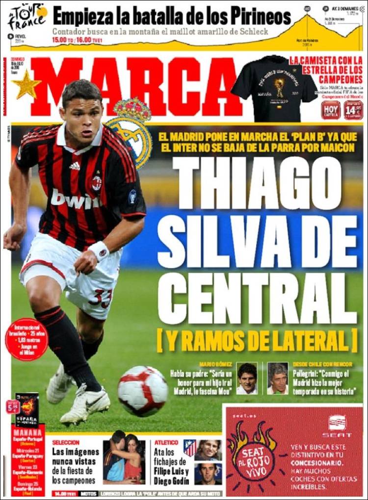 MADRID (Spagna) – Secondo quanto riporta anche la prima pagina del quotidiano spagnolo Marca, il difensore brasiliano Thiago Silva sarebbe entrato nel mirino della dirigenza del Real Madrid che lo avrebbe messo sotto osservazione e secondo le voci di calciomercato, le merengues avrebbero offerto 25 milioni di euro ma il Milan sembra li abbia rifiutati come anche l’offerta del Chelsea di 30 milioni.