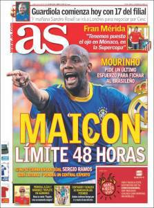 L’altro quotidiano spagnolo As parla del calciomercato del Real Madrid che è ritornato alla carica per il terzino dell’Inter Maicon. La dirigenza di Florentino Perez ha deciso di tentare l’assalto decisivo al giocatore brasiliano ma la trattativa dovrà durare solo 48 ore, termine massimo consentito al numero uno del Real Madrid ai suoi collaboratori.