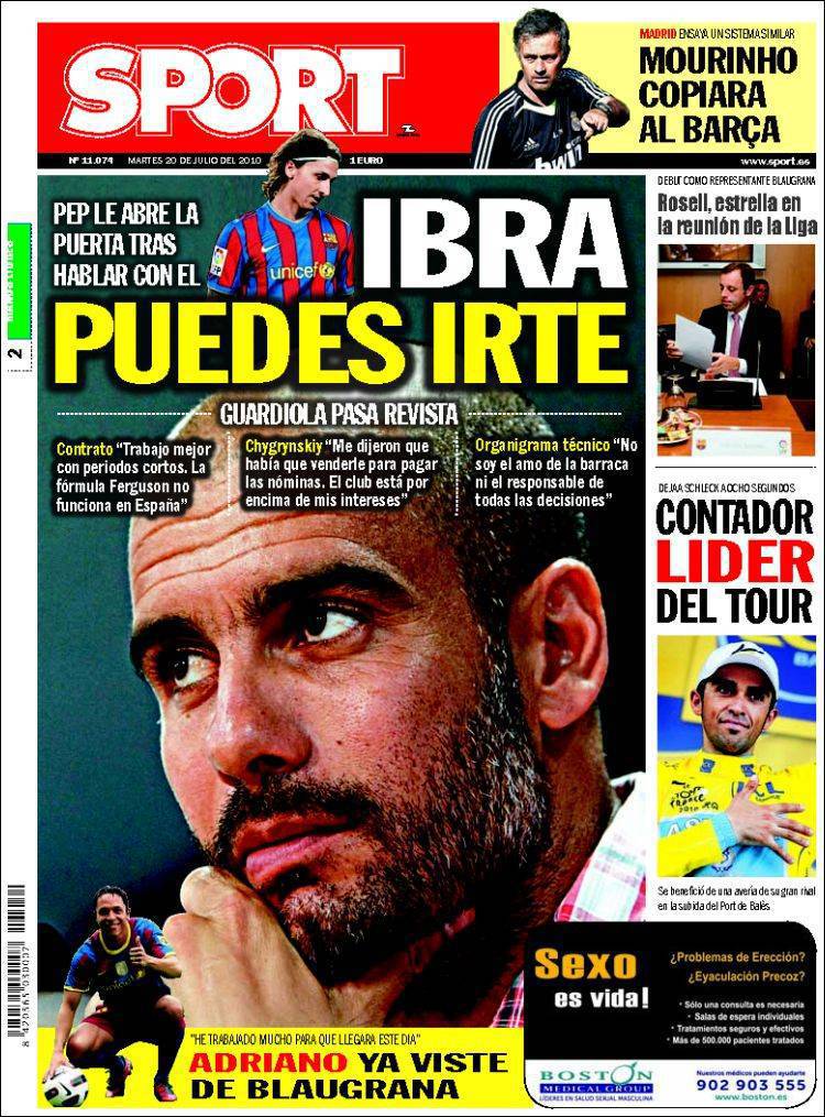 Sul quotidiano catalano Sport vengono riprese le dichiarazioni di ieri rilasciate dal tecnico del Barcellona Guardiola sul futuro di Zlatan Ibrahimovic. Guardiola ha dichiarato che sarà lo svedese a decidere il suo futuro, ovvero se vorrà rimanere con la maglia blaugrana sapendo di dover lottare per guadagnare il posto oppure andare via e cercare nuove sfide.