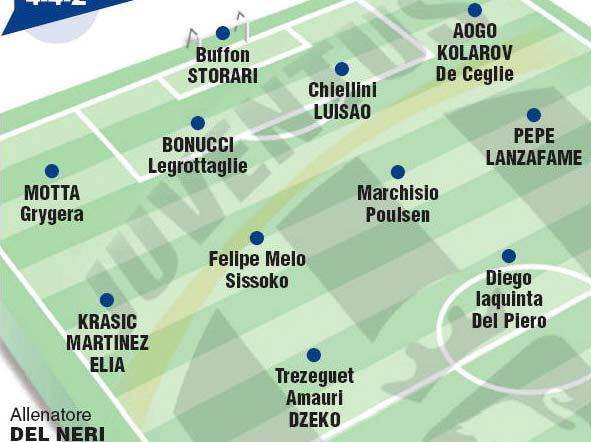 TORINO – Il quotidiano sportivo Tuttosport ha pubblicato la formazione bianconera con gli acquisti dei vari Pepe, Martinez, Bonucci più l’eventuale acquisto di Dzeko, Aogo. Un’undici bianconero che sicuramente potrebbe lottare per la conquista dello Scudetto, con un attacco che potrebbe essere formato dal gigante Dzeko ed uno tra Iaquinta, Del Piero e Diego.