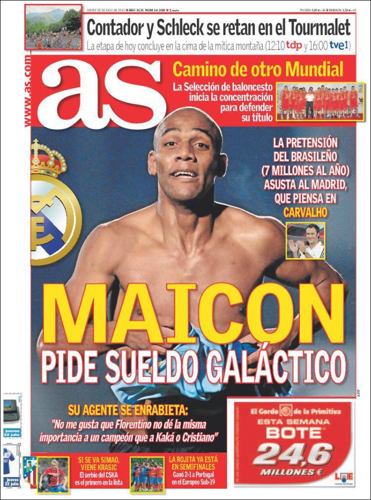 Anche il quotidiano As parla dell’affare Maicon-Real Madrid, ma questa volta non è l’Inter a fare i capricci bensì il brasiliano che ha chiesto uno stipendio annuo di 7 milioni di euro che il presidente Florentino Perez non vuole concedere. Il procuratore del giocatore, Antonio Caliendo, si è scagliato contro il presidente dei madrileni reo di non considerare importante il brasiliano.