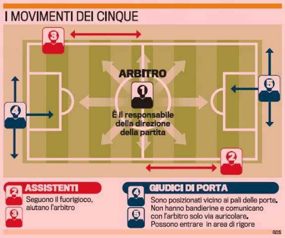 ROMA – Oggi la Fifa ha detto si agli arbitri d’area che controlleranno le due aree di rigore. In pratica oltre all’arbitro e ai due assistenti di linea ci saranno queste due nuovo figure che potranno aiutare la terna arbitrale in particolare nei famosi “gol fantasma”. La Gazzetta dello Sport ha riportato un grafico in cui vengono segnati i movimenti dei cinque arbitri.