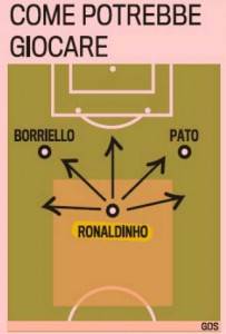 MILANO – Se il diktat presidenziale di Silvio Berlusconi vuole un Ronaldinho più vicino all’area di rigore in posizione di trequartista, il pensiero del tecnico Allegri è quello di far svariare il campione brasiliano su tutto il fronte offensivo. Come riportato dalla Gazzetta dello Sport l’ex tecnico del Cagliari ha già in mente i movimenti che dovrebbe fare in campo l’ex stella del Barcellona.