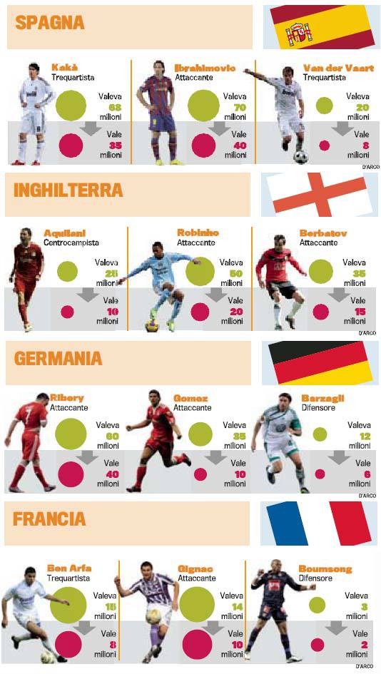 ROMA – La Gazzetta dello Sport ha realizzato una tabella molto interessante riguardante il calciomercato estero e molti nomi di alcuni campioni di cui il nome sta calando. Ci sono analizzati quattro paesi: Inghilterra, Spagna, Francia e Germania. Di nomi importanti possiamo notare: Zlatan Ibrahimovic, Franck Ribery, Mario Gomez, Kakà, Alberto Aquilani, Robinho e molti altri.