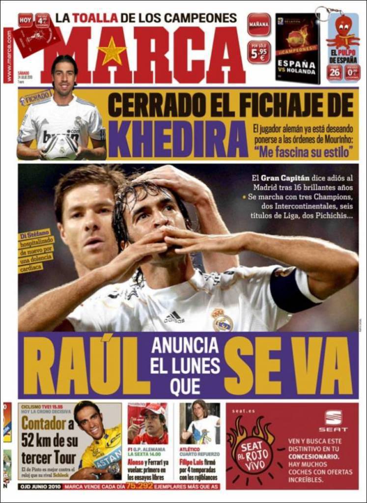 Sul quotidiano sportivo Marca si parla della storica bandiera del Real Madrid Raul che lunedì lascerà ufficialmente le “merengues” per giocare in Germania nello Schalke 04. Un addio clamoroso visto che il calciatore spagnolo ha sempre militato nei “Blancos” indossando per tantissimo tempo la gloriosa fascia da capitano. La maglia numero 7 dovrebbe passare a Cristiano Ronaldo.