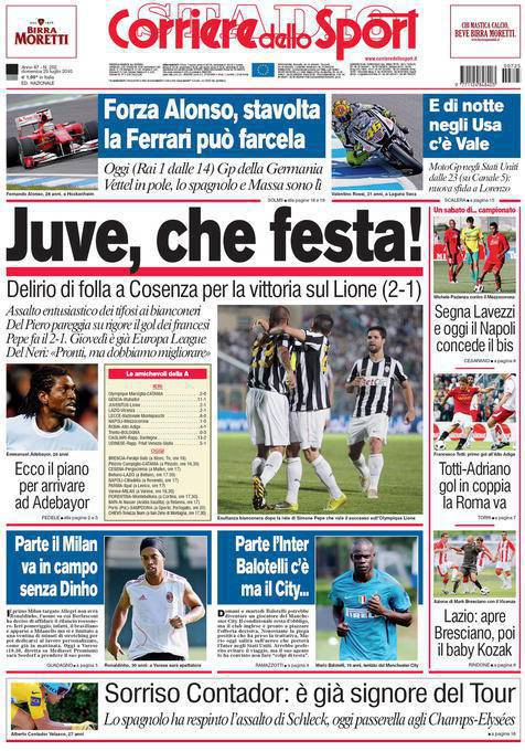 Sul Corriere dello Sport si parla della Juventus che ieri ha vinto l’amichevole internazionale contro il Lione per due a uno. I bianconeri hanno rimontato lo svantaggio iniziale grazie alle reti di Del Piero su rigore e di Pepe che ha siglato il definitivo due a uno. La partita è stata giocata a Cosenza dove la Juventus ha trovato un vero e proprio bagno di folla.