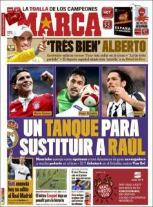 Sul quotidiano spagnolo Marca si parla del calciomercato del Real Madrid con i madrileni alla ricerca di un attaccante in grado di sostituire Raul, storico capitano che è passato allo Schalke 04. Tre i nomi più gettonati, il primo è Mario Gomez, centravanti del Bayern Monaco, il secondo è il portoghese Hugo Almeida ed il terzo è il bianconero Amauri.