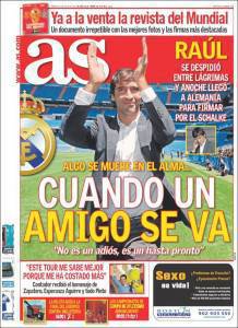 Bellissimo il titolo dell’altro quotidiano madrileno As che saluta lo storico capitano Raul definendolo un grande amico. Il grande numero 7 del Real Madrid lascia il club dopo una vita giocata con la maglia delle “merengues”. Non rientra nei piani di Josè Mourinho, il suo futuro è allo Schalke 04, anche se Raul ha dichiarato di voler tornare da dirigente.