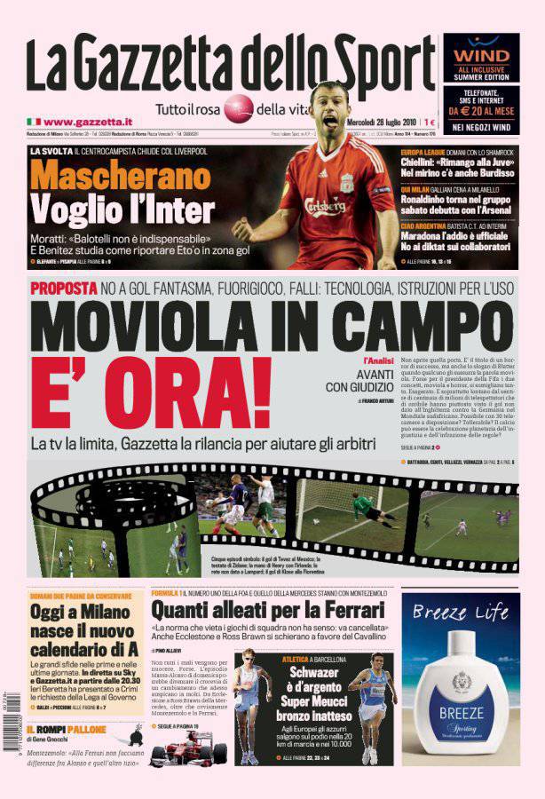 Sulla Gazzetta dello Sport si parla della moviola in campo ribadendo il concetto di un aiuto tecnologico a favore degli arbitri. L’argomento moviola è molto caldo soprattutto dopo la presa di posizione della Rai che ha dichiarato di non voler mostrare più immagini di moviola, mentre Mediaset e Sky hanno ribadito il loro concetto di intoccabilità della moviola.
