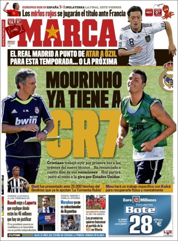 Sul quotidiano spagnolo Marca si parla del Real Madrid ed in particolare del rapporto tra Josè Mourinho, nuovo tecnico dei madrileni, e Cristiano Ronaldo, connazionale dello Special One. Il fuoriclasse portoghese ha rinunciato a quattro giorni di vacanza per ritornare a disposizione dell’ex tecnico dell’Inter, e si è già messo al lavoro ed è pronto a volare negli Stati Uniti con il resto della squadra.