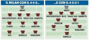 VARESE – Massimiliano Allegri studia un Milan camaleontico capace di potersi schierare con due moduli. Il primo, confermatissimo, è il 4-3-3 usato anche da Leonardo nella scorsa stagione, con il trio di centrocampo formato da Flamini-Pirlo-Ambrosini, mentre in difesa a destra spazio al greco Papastathopoulos. In attacco confermato il trio Pato-Borriello-Ronaldinho. L’altro modulo studiato è il 4-2-3-1, in questo caso a centrocampo spazio a Gattuso-Ambrosini, con Pirlo avanzato sulla linea dei trequartisti. Ecco la foto ripresa dal Corriere dello Sport.