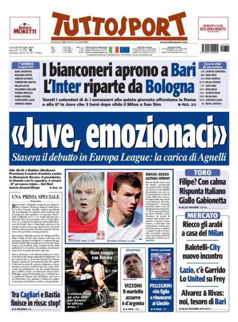 Sul quotidiano torinese Tuttosport spazio alle dichiarazioni del presidente della Juventus Andrea Agnelli che in vista dell’andata del preliminare di Europa League contro lo Shamrock Rovers, in programma questa sera a Dublino, carica i bianconeri chiedendo una prova gagliarda capace di far emozionare tutti i tifosi della Juventus.