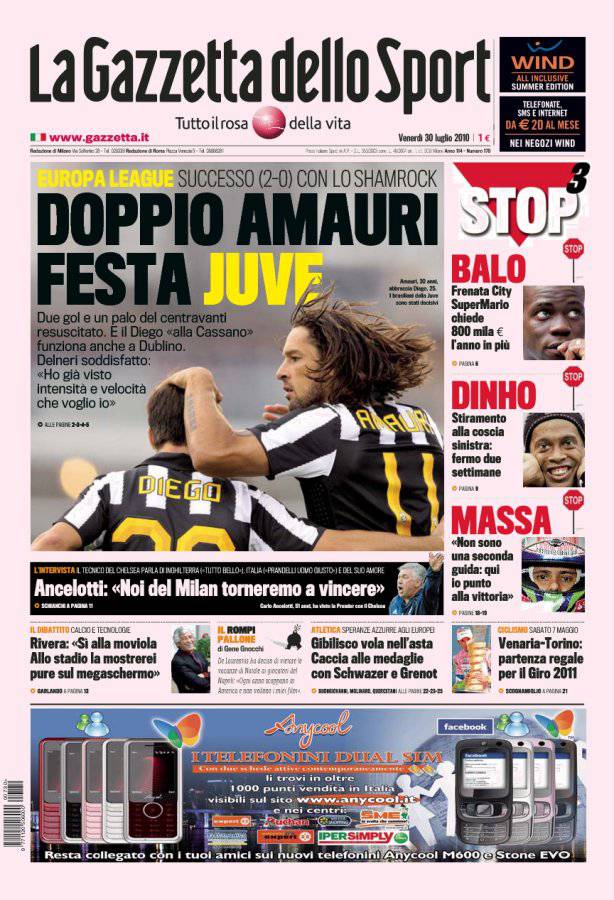 La Gazzetta dello Sport apre con la vittoria della Juventus a Dublino contro lo Shamrock Rovers nell’andata dei preliminari di Europa League. I bianconeri hanno battuto gli irlandesi con un netto due a zero ipotecando l’accesso alla fase successiva. I gol sono stati segnati entrambi da Amauri. Ottima la prova del brasiliano e del connazionale Diego.