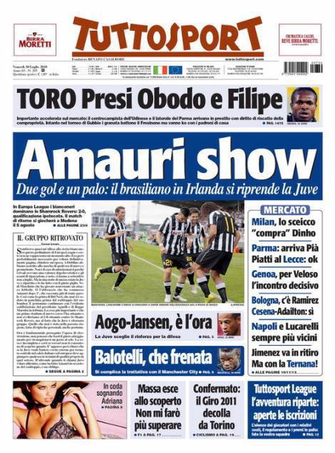 Ovviamente il quotidiano torinese Tuttosport non poteva non celebrare la bella vittoria della Juventus in Europa League contro lo Shamrock Rovers. Bene la squadra di Delneri che ha già fatto intravedere una buona condizione fisica. Il ritorno è previsto il 5 agosto a Modena, anche se il due a zero finale ha di fatto ipotecato l’accesso alla fase successiva per la formazione bianconera.