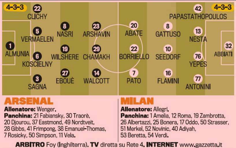 LONDRA (Inghilterra) – Il Milan di Massimiliano Allegri questo pomeriggio affronterà l’Arsenal nel primo match dell’Emirates Cup. Nell’undici rossonero spazio in difesa ai due nuovi acquisti Yepes come centrale difensivo accanto a Nesta, mentre il greco Papastathopoulos impiegato come terzino destro. Ecco le formazioni riportate dalla Gazzetta dello Sport.