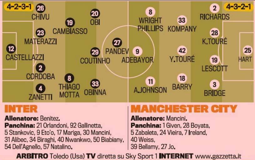BALTIMORA (Stati Uniti) – Questa sera amichevole di lusso per la nuova Inter di Rafa Benitez che a Baltimora affronterà il Manchester City dell’ex tecnico nerazzurro Roberto Mancini. Un test che permetterà al tecnico spagnolo di valutare la condizione atletica dei suoi ragazzi ed in particolare di scrutare il talento di Coutinho. Ecco le formazioni riportate dalla Gazzetta dello Sport.