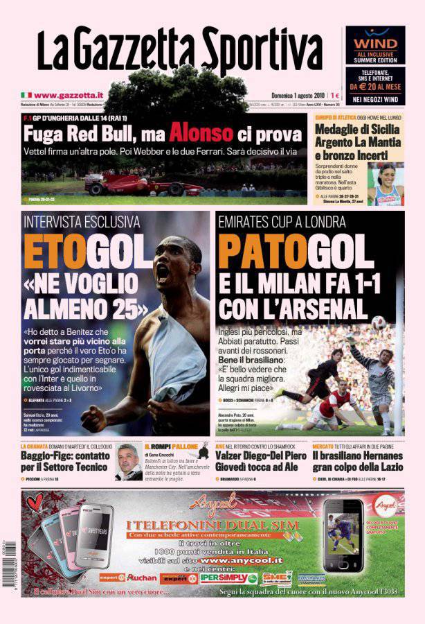MILANO – Ieri si sono giocatealcune amichevoli, una di queste è stata giocata dal Milan che nell’Emirates Cup ha pareggiato 1 a 1 contro l’Arsenal grazie ad un gol di Pato. Sempre riguardante l’altra squadra di Milano, cioè l’Inter, come riporta la Gazzetta dello Sport in prima pagina, l’attaccante camerunense Samuel Eto’o in un’intervista ha rilasciato di voler segnare quest’anno almeno 25 gol.